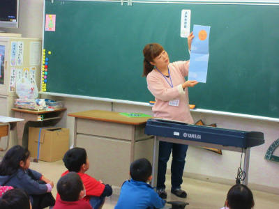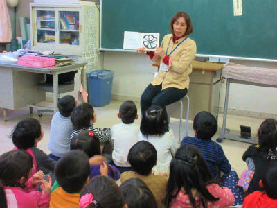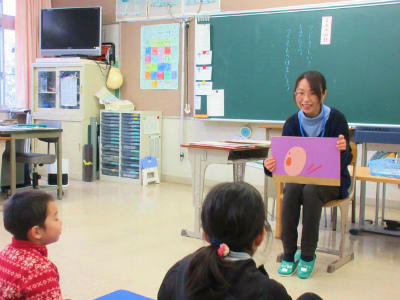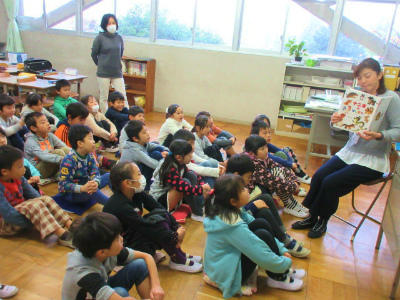 先週の木曜日は雪が降りました。今週の木曜日は雨が降り、気温が下がったため、エアコンをつけた教室での読み聞かせとなりました。