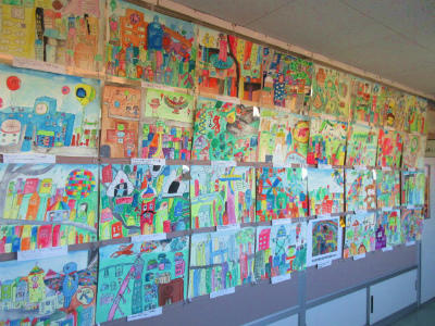 廊下に掲示されている絵です。空から見下ろした街並みを描いています。