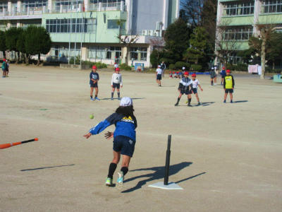 体育の授業で三角ベースボールに挑戦です。ティーに乗せたボールを打つので、野球経験がない子も活躍できます。