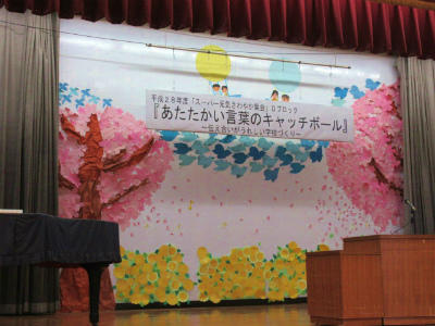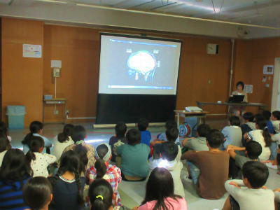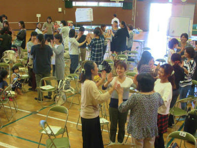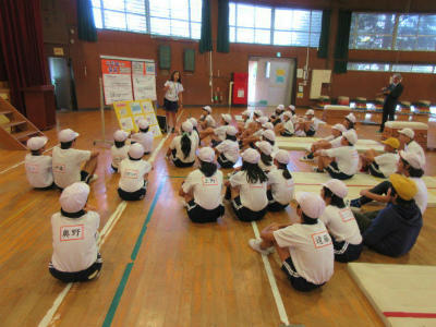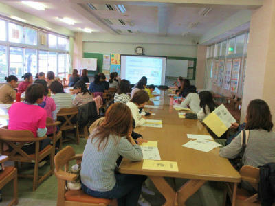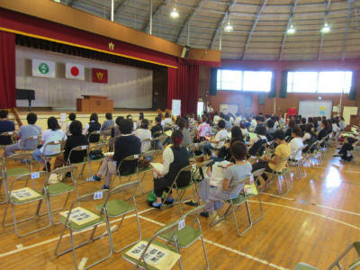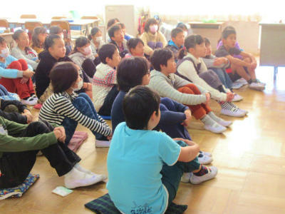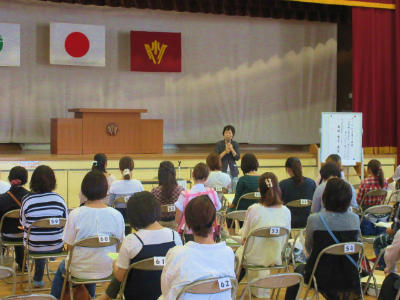 子どもたちが健康診断を受けている間、体育館では埼玉県家庭教育アドバイザーによる「すこやか子育て講座」が行われました。