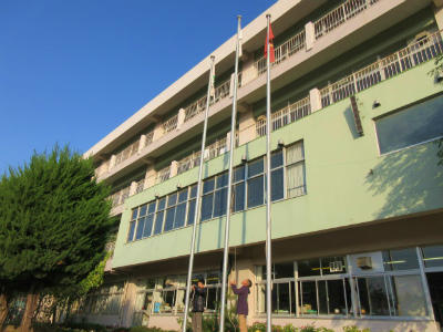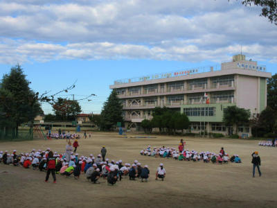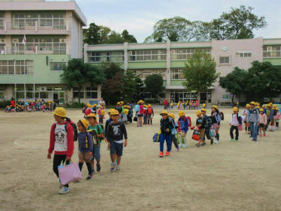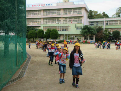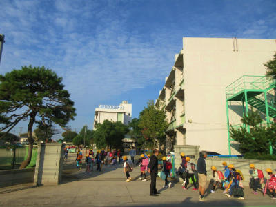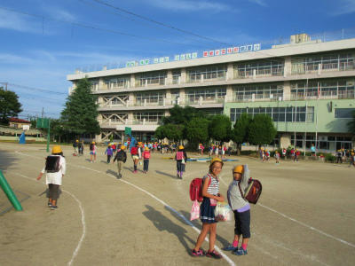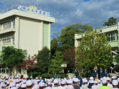 武里小では、校門を入った児童が昇降口に向かうときに、校庭の中を通過していきます。
