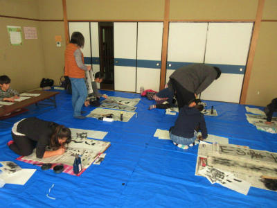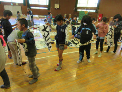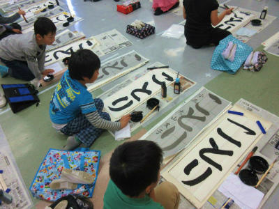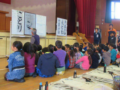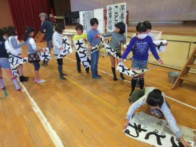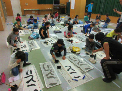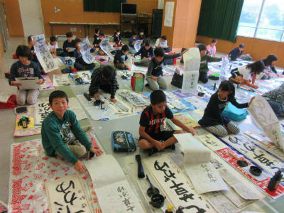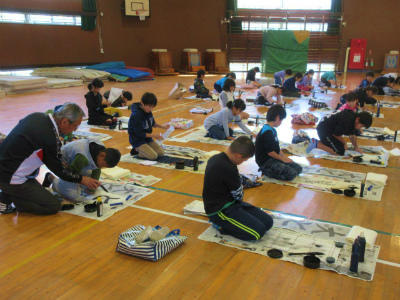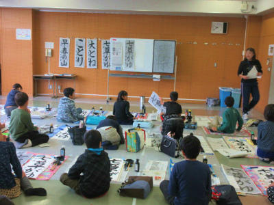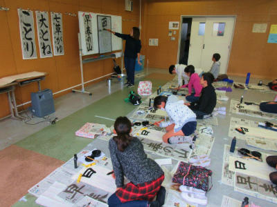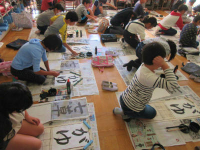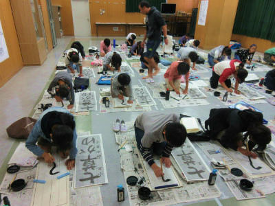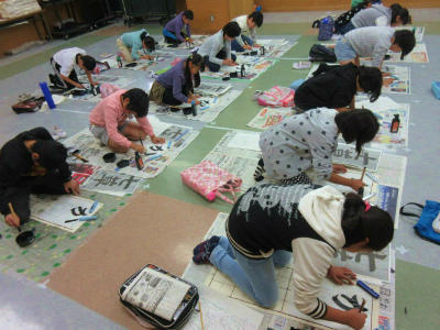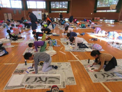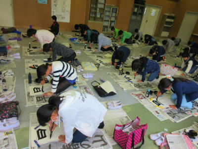 書道の先生をお招きし、体育館で学年全体の練習を行いました。