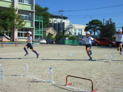 3年生のハードル走は、発達段階に合わせてミニハードルや手作りのハードルを使用します。少しずつ、歩数のリズムをつかんでいきます。