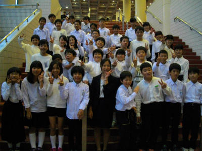 合唱を終えた子どもたち、音楽の先生、担任の先生、引率の先生。全員が笑顔で音楽会を終えることができました。