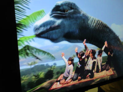 映像を合成すると、空飛ぶ絨毯に乗って恐竜に近づいているように見えます。
