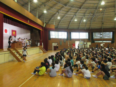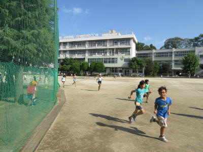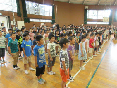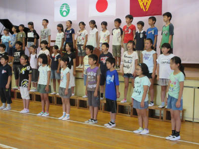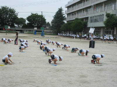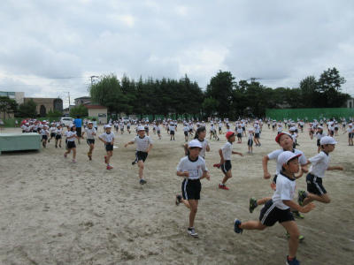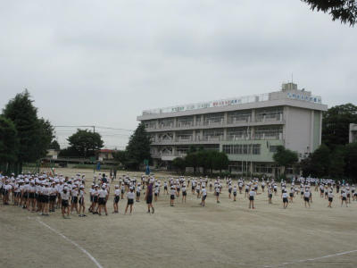 どことなく秋が近づいていることを感じさせる空の下、約180名の児童が元気に体操をしました。ラジオ体操連盟の方は、「こんなに多くの子どもたちが参加する学校は見たことがない。」と驚いていらっしゃいました。