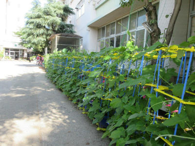 1・2年生が育てているアサガオとミニトマトが、ぐんぐん大きくなっています。