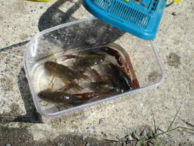 中野中近くの用水路でザリガニ釣りをしました。保護者のボランティアの皆さんにも見守っていただき、たくさんのザリガニを捕まえることができました。