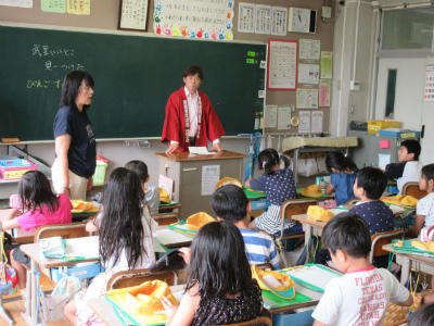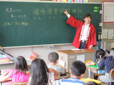 今日は、PTAの石川会長をお招きして、武里小のすぐ裏にある「備後須賀稲荷神社」について、いろいろなことを教えていただきました。