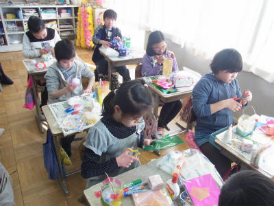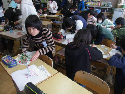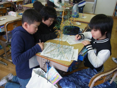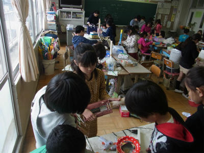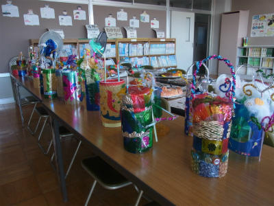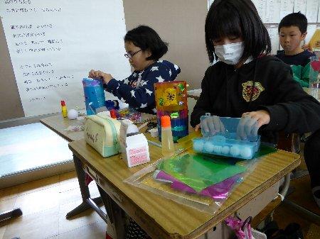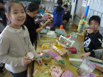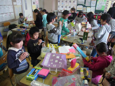 3年生の図工です。箱や筒、輪ゴムなどを組み合わせてユニークな楽器ができあがっていきます。みんな楽しそうですね。