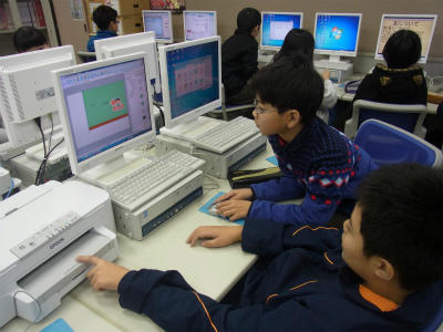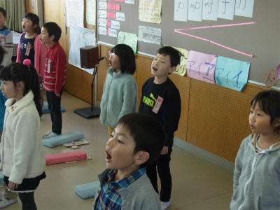 音楽室での授業です。基本的な発声練習の後、校歌を歌い始めました。1年生ながら、十分な声量があります。将来が楽しみですね。
