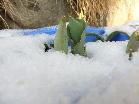 そして、1年生のチューリップの鉢植えにもたくさんの雪です。