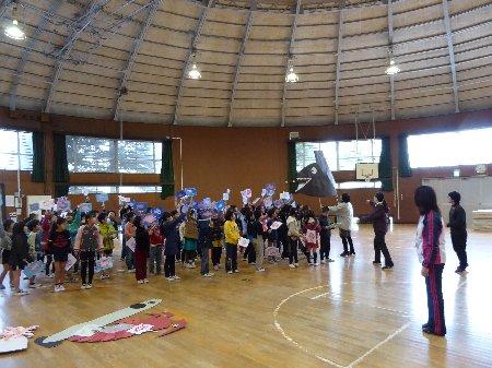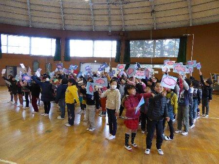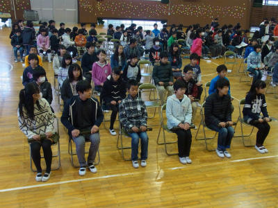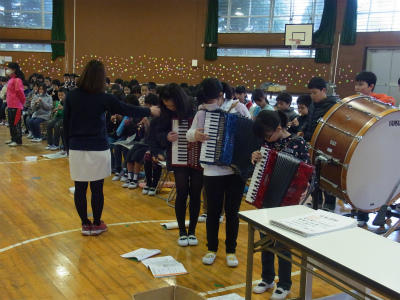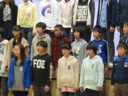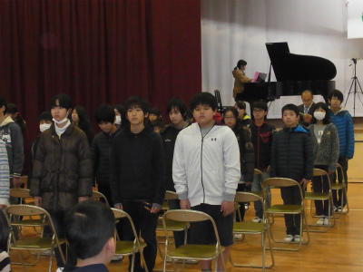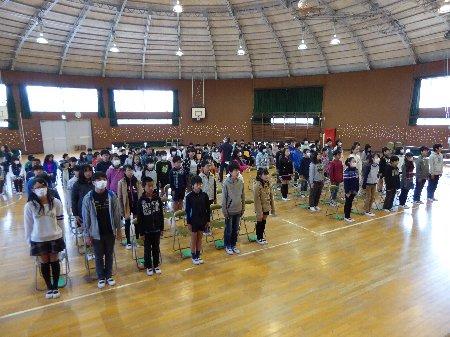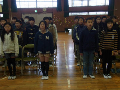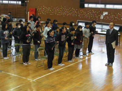 今日は、5・6年生の合同練習です。冷え切った体育館の中で、歌と呼びかけと退場を中心に行いました。