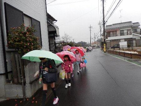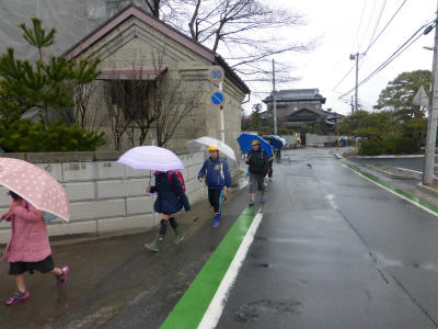 来年度の通学班の名簿づくりや班長・副班長の引継ぎを行いました。 あいにくの雨のため、傘を差しての一斉下校となりました。