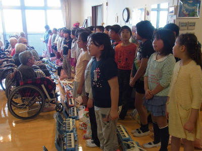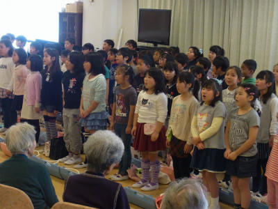 3月8日の午後に、3年生児童が特別養護老人ホーム「フラワーヒル」を訪問しました。入居者さんや利用者さんの前で、この日のために練習してきた合唱や演奏を全力で披露しました。
