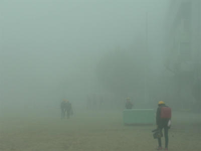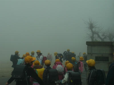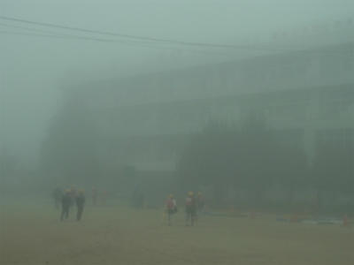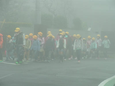今朝は、一面深い霧に包まれていました。そんな中、昨日の通学班編成を終えた子どもたちが元気に登校してきました。校門を入ると真っ白な世界が広がっており、驚きの声が聞こえてきました。
