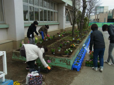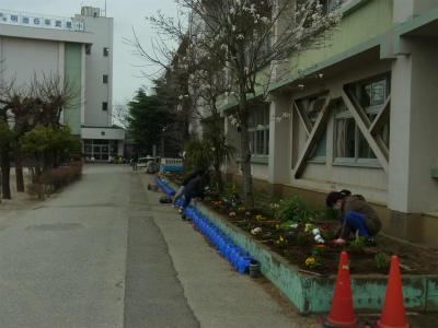 PTA厚生部の皆様が、校庭の花壇に新しい花を植えてくださいました。いつ雨が降り始めてもおかしくない天候でしたが、無事に作業が終了しました。