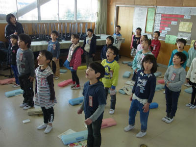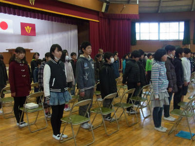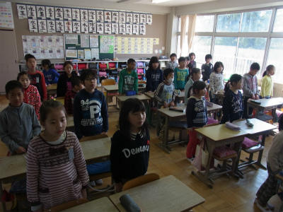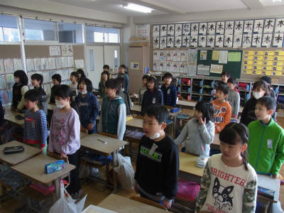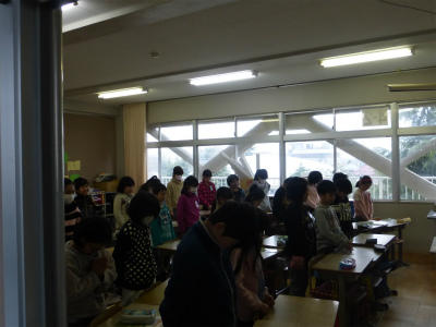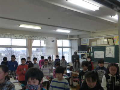 地震発生時刻の2時46分にあわせ、全校児童で黙とうを捧げました。