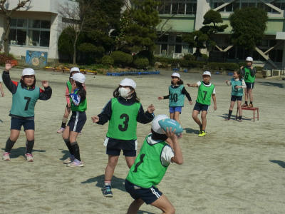 柔らかいラグビーのボールが使われていますね。丸いボールと違って、投げたりキャッチしたりするのが難しいようです。