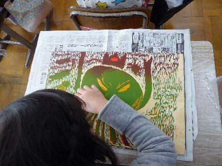 切り抜いた紙やみのまわりのものを使って版画のように作品をつくっているのは3年生です。