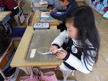 1年生がかいているのは「楽しかったふゆやすみ」です。