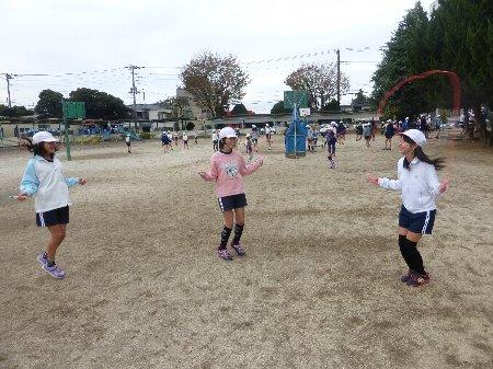 いろいろな跳び方を練習した後、リズムなわとびです。