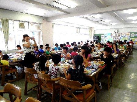 わかたけホール(ランチルーム)で、ほかの学年と一緒に給食を食べる「なかよし給食」。