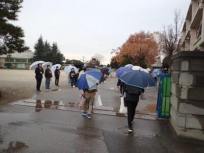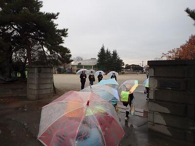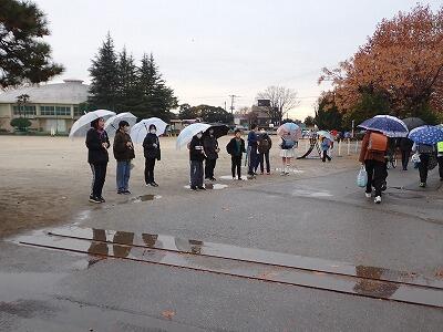 わかたけ委員の子供たちは、雨でも「あいさつ運動」に取り組みます。