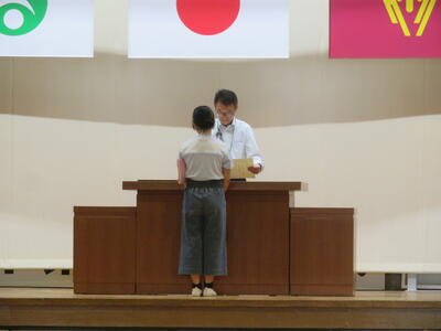 表彰を行い、本人が作文を全校児童の前で読みました。