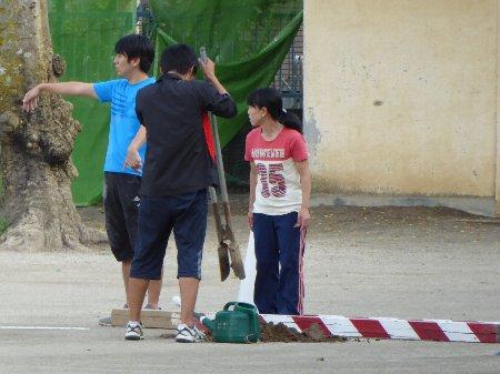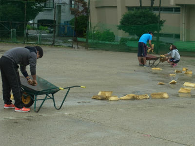 予想以上に雨が早くやんだので、明日の運動会に向けて、朝から先生たちが校庭整備を始めました。