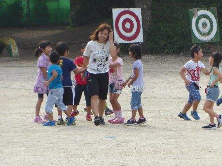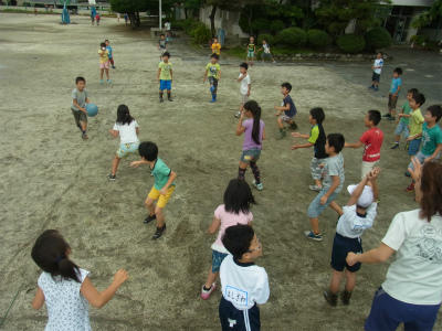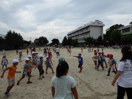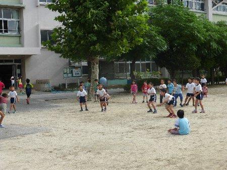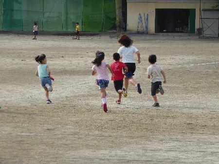 1年生が朝から先生を追いかけて、校庭を走り回っています。