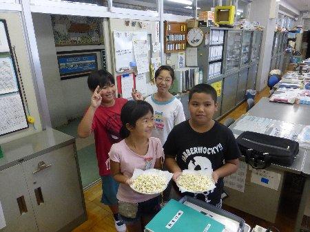 学級園で育てたトウモロコシで作ったポップコーンを職員室に届けてくれました。