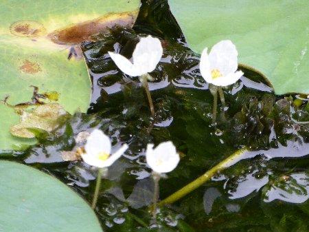 水面をみると藻の白い小さな花がたくさん咲いています。