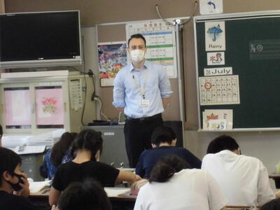 英語専科の教諭と共に、毎週(木)はALT(外国語指導助手)と、毎週(月)(水)はJTE(小学校英語指導助手)と英語の授業を行っています。