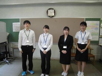 先週から養護教諭実習(保健室)を行っている学生に加え、今日から新たに3名の教育実習が始まりました。5年1組・6年1組・6年2組に入ります。4週間よろしくお願いいたします。