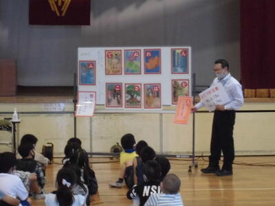 密にならないように、大きなかるたを使い体育館いっぱいに広がって行いました。