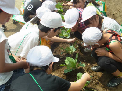 虫眼鏡を使って、モンシロチョウの卵を観察しています。