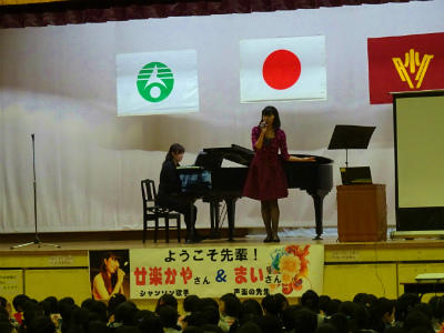 本校出身のシャンソン歌手である廿楽かやさんと姉のまいさんをお招きし、歌やトークを披露していただきました。