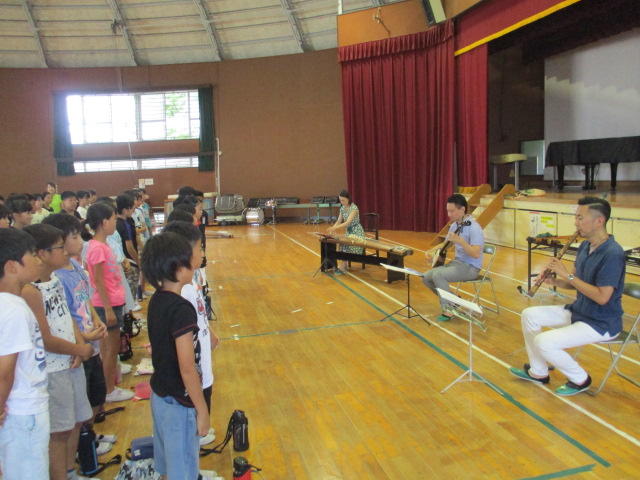 芸術家を招いての音楽授業 投稿日時 : 2018/07/17 武里小 カテゴリ: 本日体育館で、6年生を対象tした「芸術家を招いての音楽授業」を行いました。こちらの写真は、箏、尺八、三味線のプロ演奏者が奏でる校歌の伴奏で、子供たちが斉唱している一場面です。