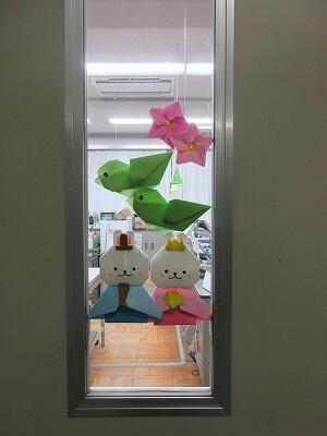 職員室前方の入口に折り紙が貼ってあります。3月3日はひな祭り。近くを通る時に見てください。
