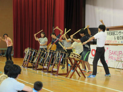 桜プロジェクト 2 投稿日時 : 2016/06/20 武里小 カテゴリ: 目の前で、すごい迫力の演奏と楽しいパフォーマンスが展開されました。 その後、体験コーナーが始まると、太鼓打ちを志願する子どもたちの声が丸い体育館に響き渡りました。 最後は、先生5人によるパフォーマンスもありました。