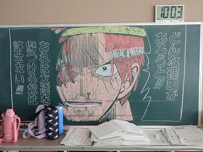 5年1組の黒板掲示。「どんな理由があろうと、おれは友達を傷つける奴は許さない!」