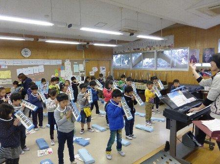 カスタネットや鍵盤ハーモニカ、トライアングルなどを使った合奏です。