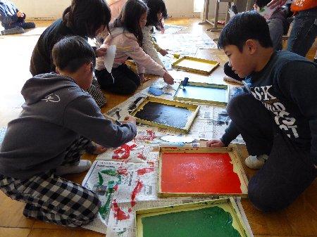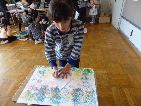 切り抜いた紙やみのまわりのものを使って版画のように作品をつくっているのは3年生です。