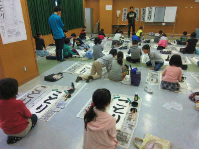 書道の先生をお招きし、体育館で学年全体の練習を行いました。