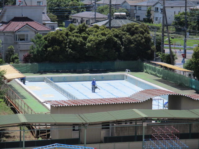 プールの安全点検を実施したところ、塗装等を行う必要がある箇所が見つかり、急遽、修繕を行いました。水泳学習開始期日は、6月11日(月)からの予定です。