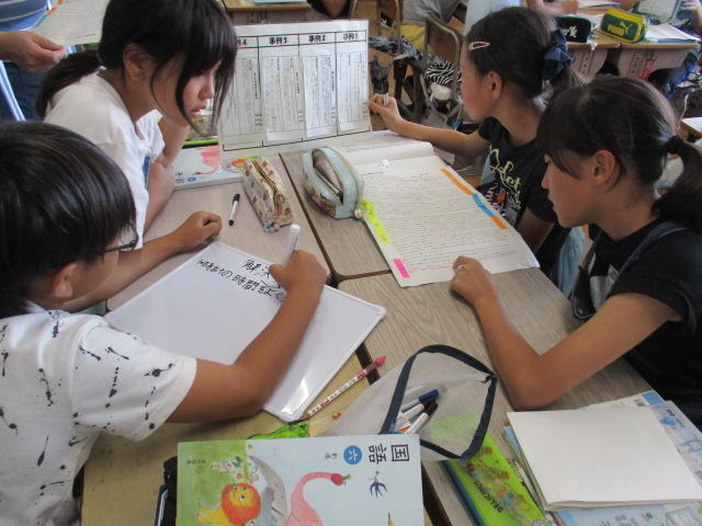本校では、確かな読み取りをもとに、豊かな学びを追究する児童の育成を目指し、国語科を研修教科としています。本日も、①自分の考えを根拠を明確にして発言、②グループで意見交換、③要旨をまとめる 等の学習に集中している子どもたちの姿が見られました。
