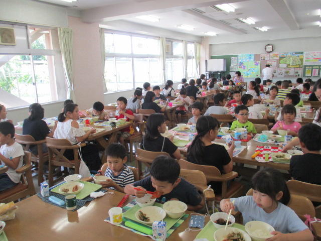 6年2組と1年1組の交流給食がありました。1年生は、お兄さんお姉さんとおいしく給食をいただきました。6年生は、配膳の仕方や給食のマナーを、弟、妹たちにお手本を示していました。