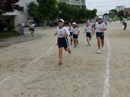 今月のわんぱくタイムは高学年は校庭の大回り、中学年は中まわりトラックを使って「走」を、低学年は朝礼台の前での運動となわとびです。