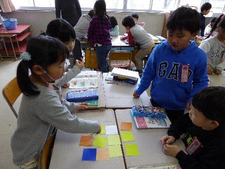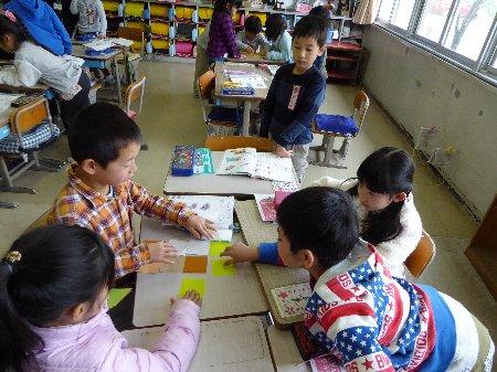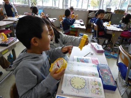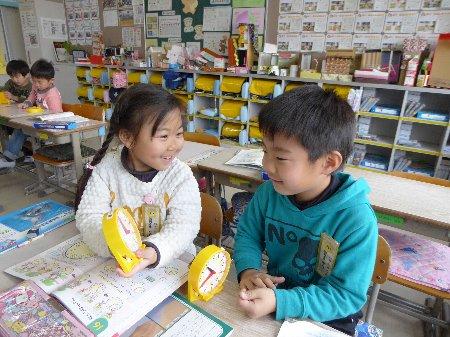 何時何分を時計で表したり、となりの人に問題をだしたりして、マスターします。